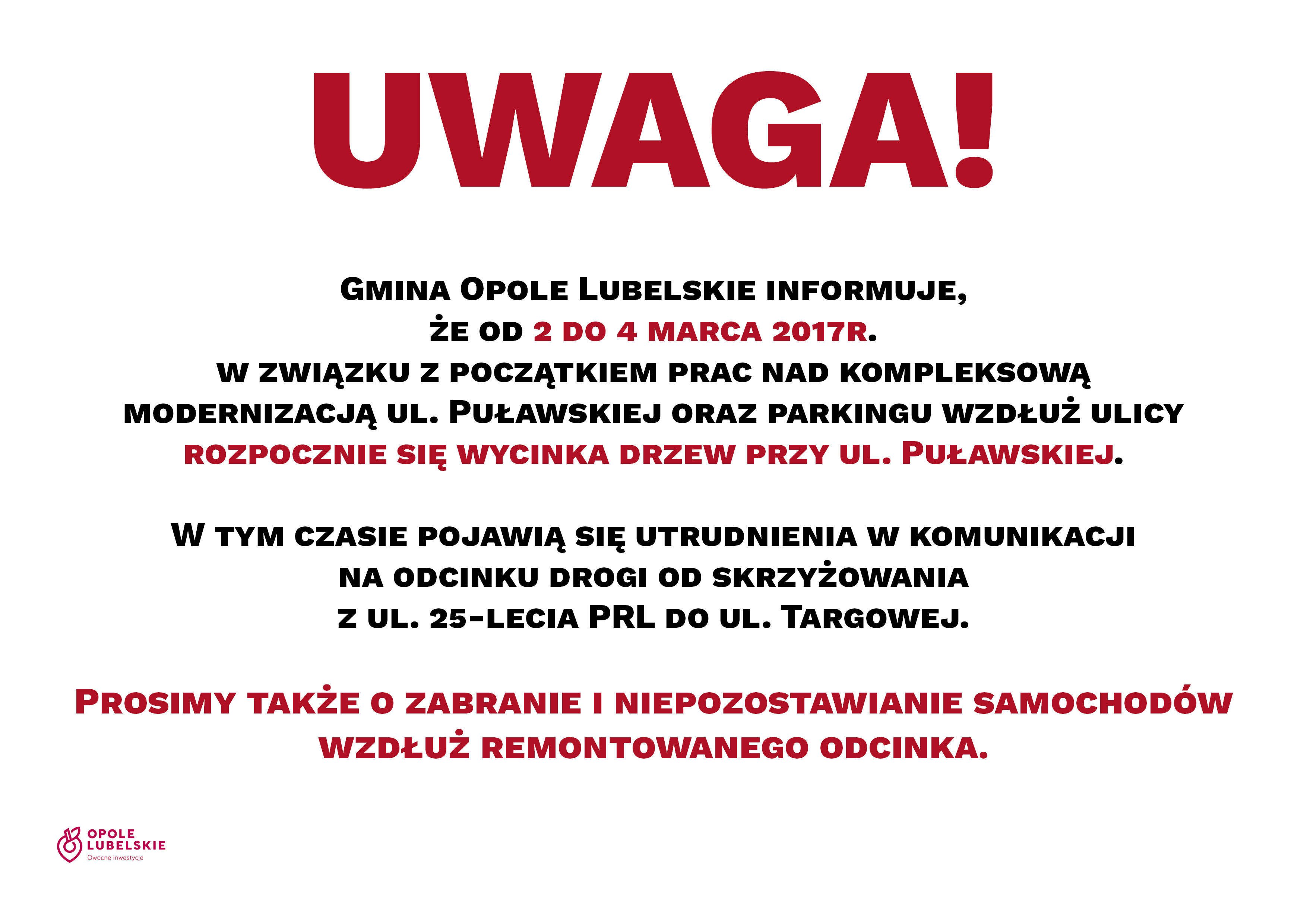 że od 2 do 4 marca 2017r. w związku z początkiem prac nad kompleksową modernizacją ul. Puławskiej oraz parkingu wzdłuż ulicyrozpocznie się wycinka drzew przy ul. Puławskiej.